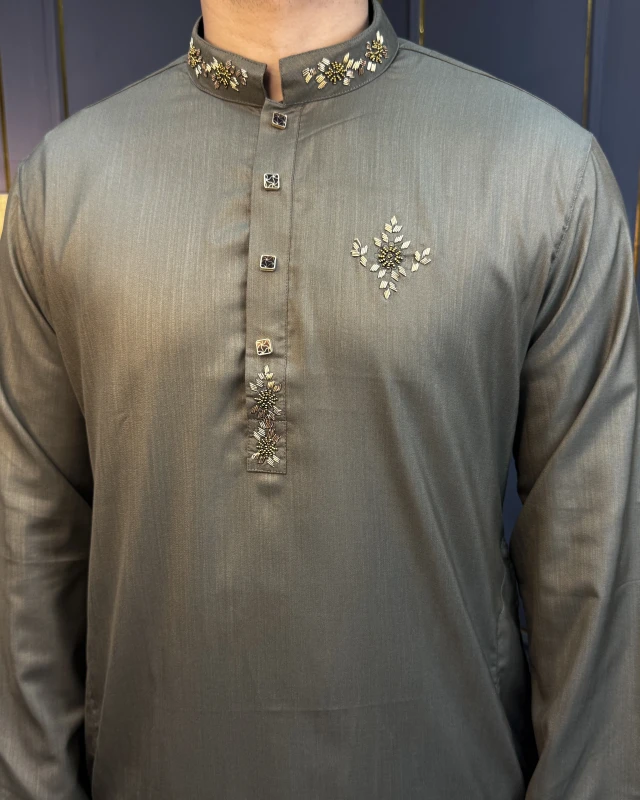 What sets this panjabi apart is the handcrafted Karchupi and Zardozi detailing carefully placed along the collar, placket, and chest motif. Metallic threads and subtle bead accents create a refined shimmer — not loud, but powerful enough to reflect elegance and heritage in every movement.