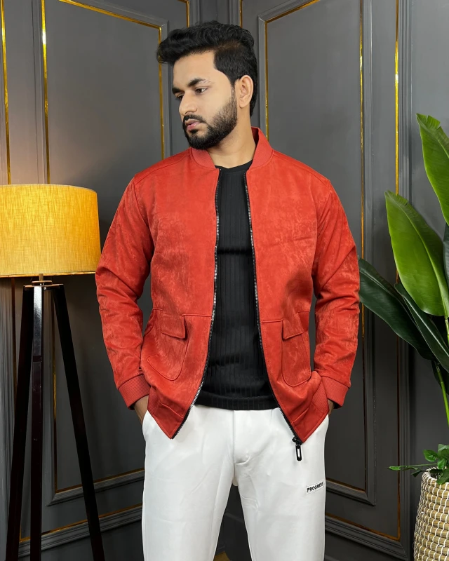 Designed with a full front zipper, ribbed cuffs, and dual utility pockets, it combines functionality with timeless style. The lightweight build ensures all-day comfort, while the rich burnt-red color adds a strong masculine statement to any outfit.
