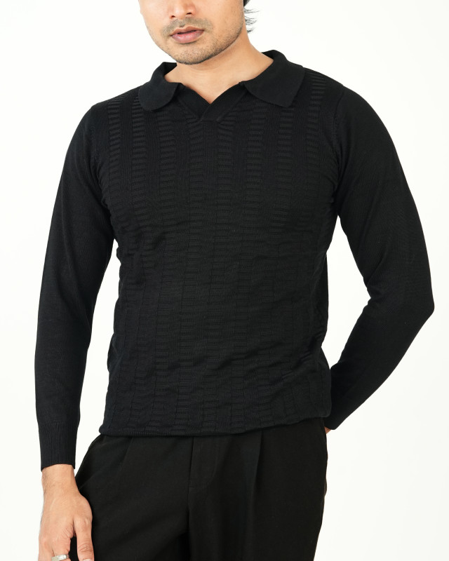 Premium Old Money Full Sleeve Textured Knit Polo - Black