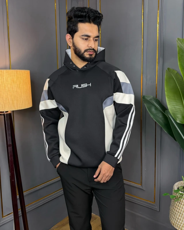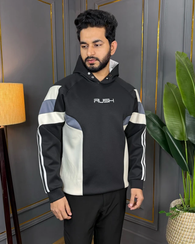 Crafted with high-quality imported fabric, this hoodie delivers a soft feel on the inside and a structured, masculine silhouette on the outside. The bold color-block design, contrast panels, and sporty sleeve stripes create a modern, dynamic look that stands out without trying too hard.