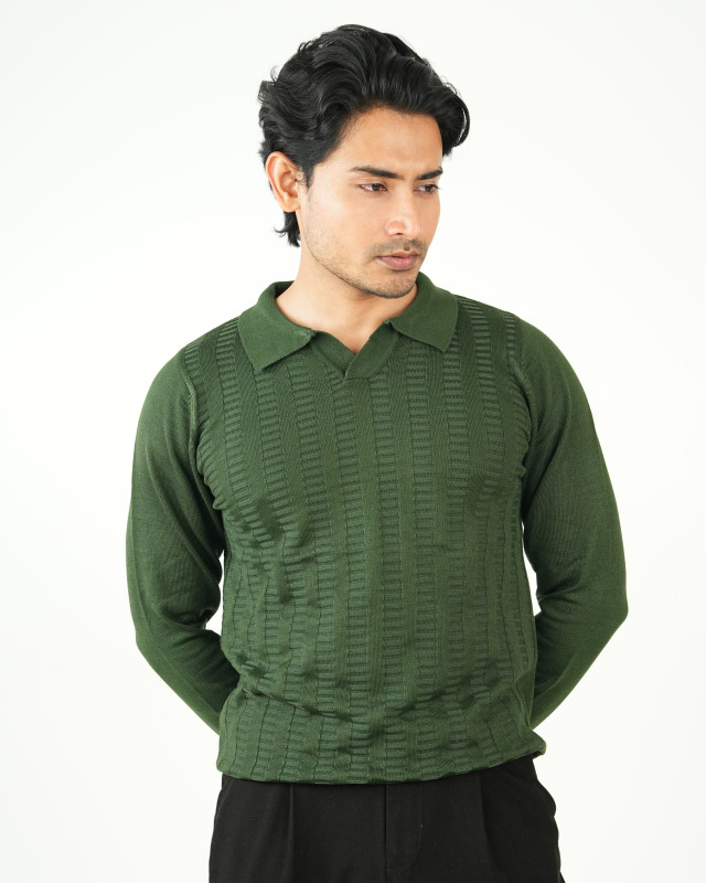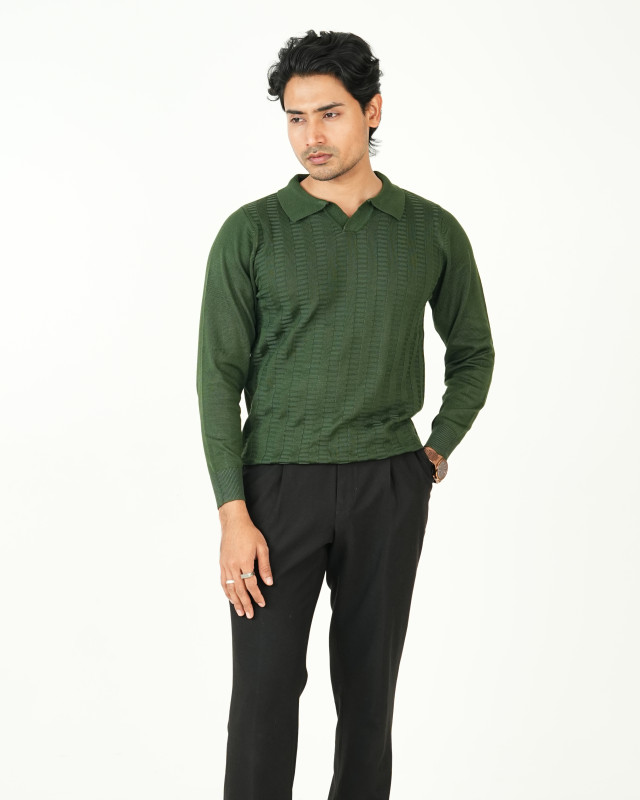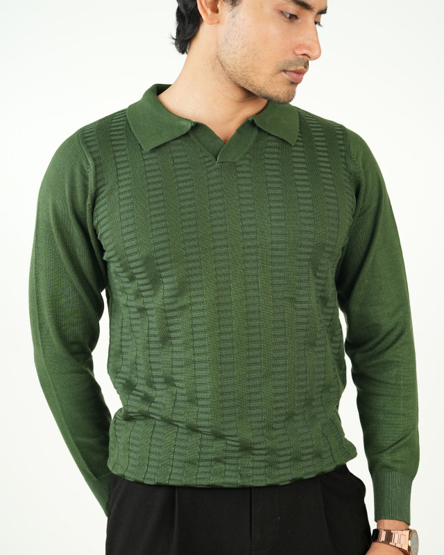 Premium Old Money Full Sleeve Textured Knit Polo - Bottle Green