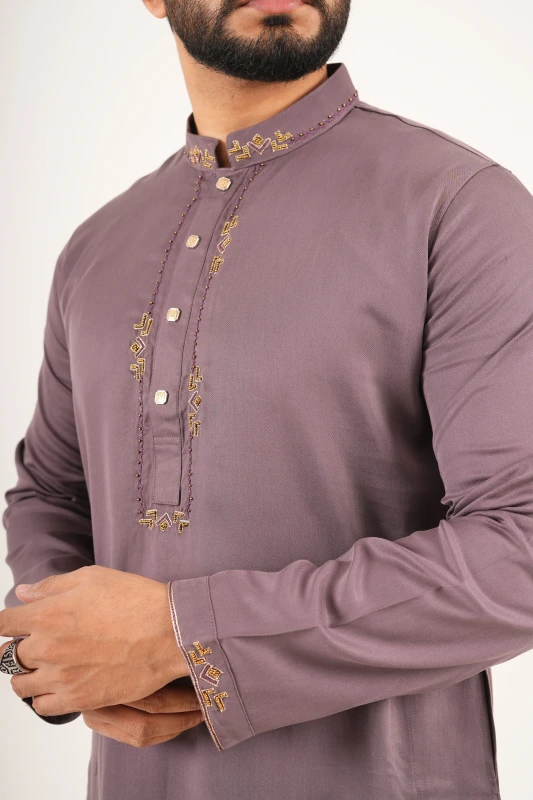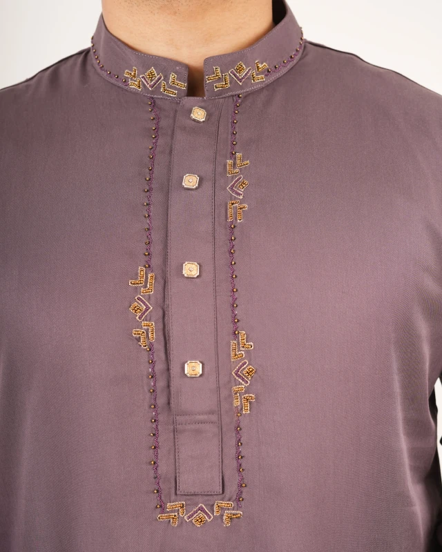 Crafted in a refined mauve-taupe base, this piece features authentic handcrafted Zardozi detailing with metallic thread and bead accents along the collar and placket — designed for men who appreciate legacy craftsmanship and subtle royalty.