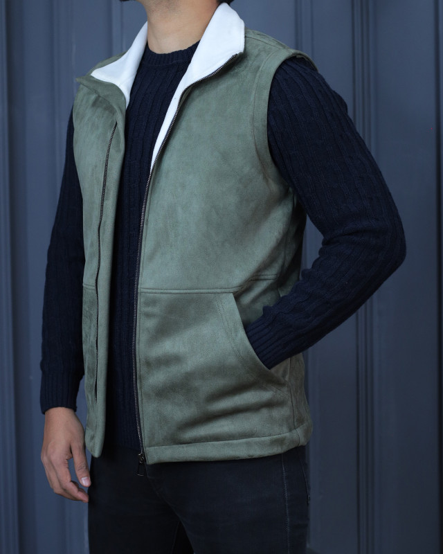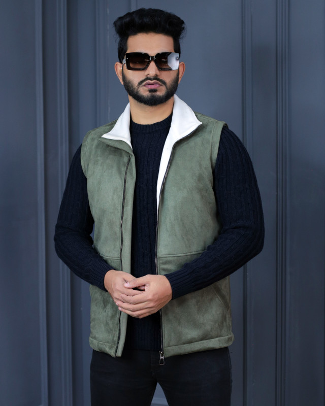 Premium Quality Suede Leather Half Jacket Witth Sherfa - Olive